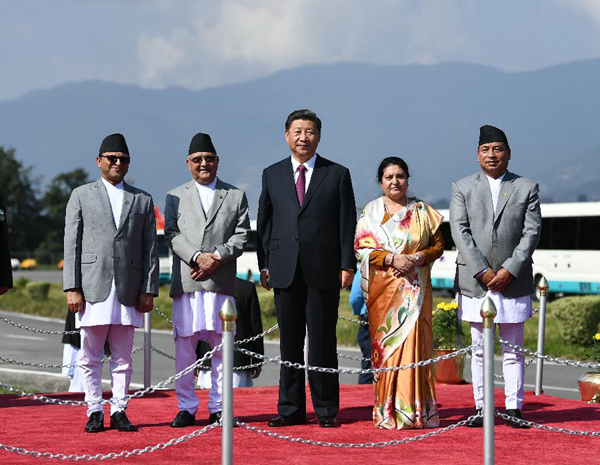 10月12日,國家主席習近平乘專機抵達加德滿都,開始對尼泊爾進行國事訪問。尼泊爾總統班達里在機場為習近平舉行具有濃郁尼泊爾民族特色的歡迎儀式。新華社記者高潔攝