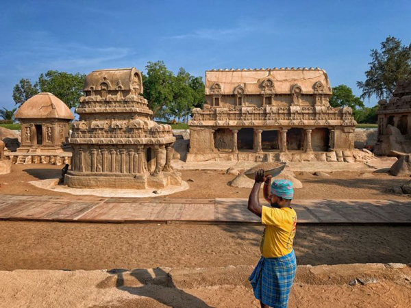 10月8日,印度工人正在五戰(zhàn)車神廟為迎接習近平主席來訪做準備。新華社記者申宏攝
